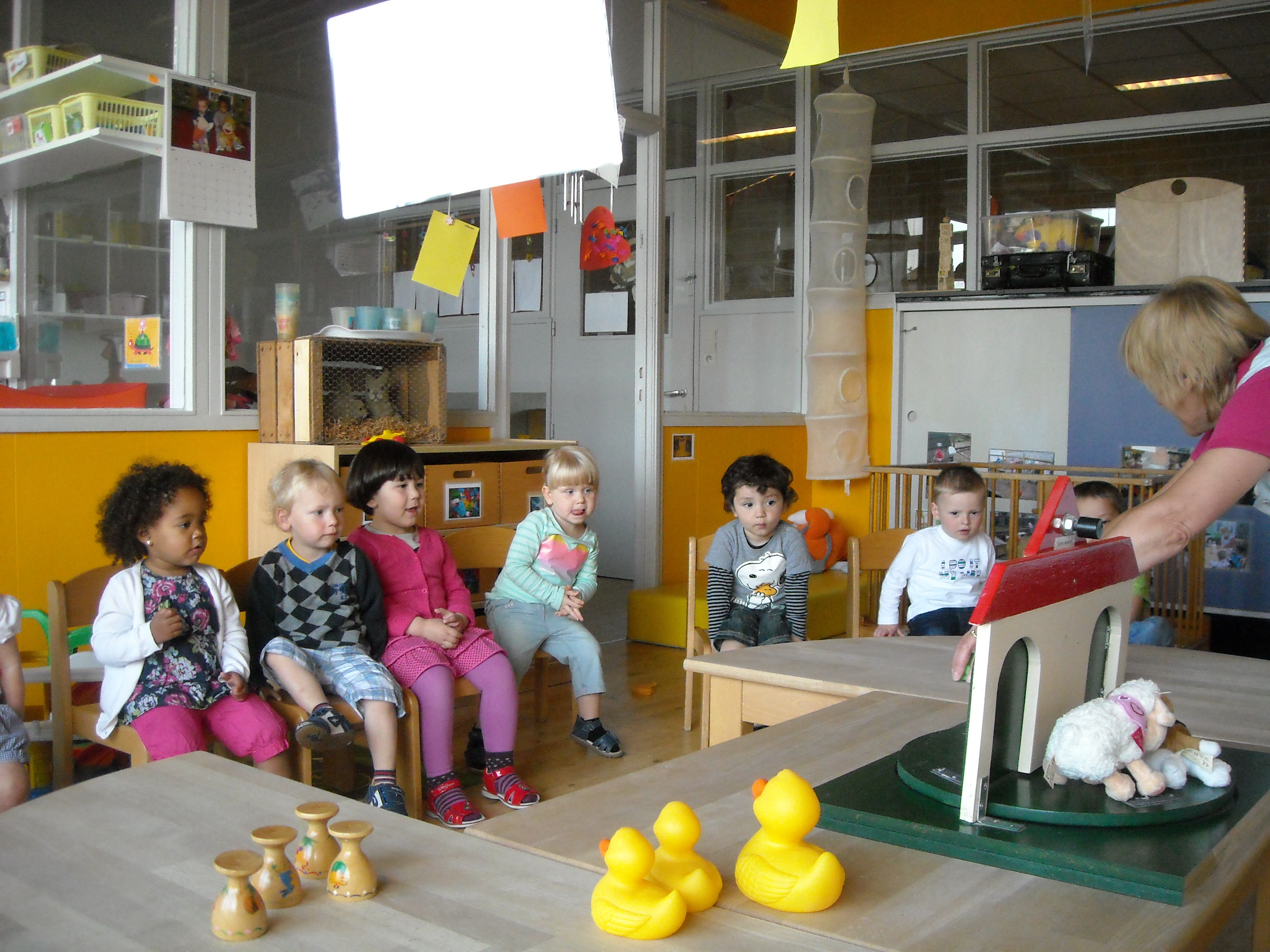 Een beeld van de verschillende groepen met hun hoekenwerking ( zoals poppenhoek, autohoek, keukenhoek, verkleedkoffer, rustige en actieve hoek…):- de baby’s/Welpjes krijgen regelmatig babymassage en komen tot rust in de tummy tub of de draagdoek , gaan soms eens mee naar buiten in de buggy, versterken hun spieren op de Bobathbal, prikkelen hun zintuigen met de voeldozen…